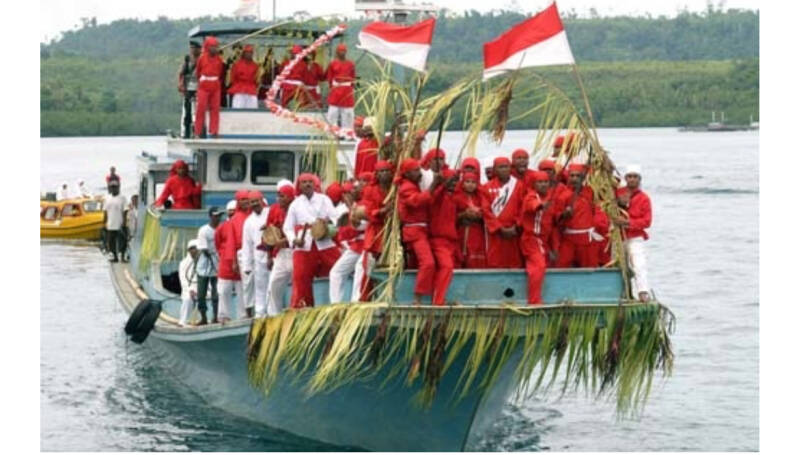 Klikalifuren uit KAIBOBO die van het eilans Ceram onderweg zijn naar hun PELA, MIJN DORP SULI voor een Panaspela9het opwarmen vamn het pelaverbond tussen suli en de pela keras kaibobo