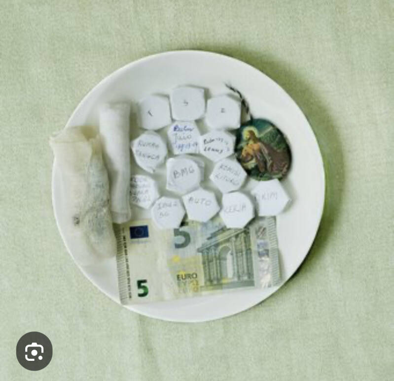 De PIRING NATZAR. Een bordje met in papier verpakte munten met daarop de initialen van elk gezinslid.ikheb nade dood vanmijn vader het schoteltje gekregen. De muntjes aan mijn broer en zusjes gegeven. He isde bedoelng dat ik op mijn beurt voor ieer gezinslid en muntje inpak envoorzie van de initialen. Voordat jenar de kerk ging moest er in de nabijheid van e piring natzar gebeden worden.