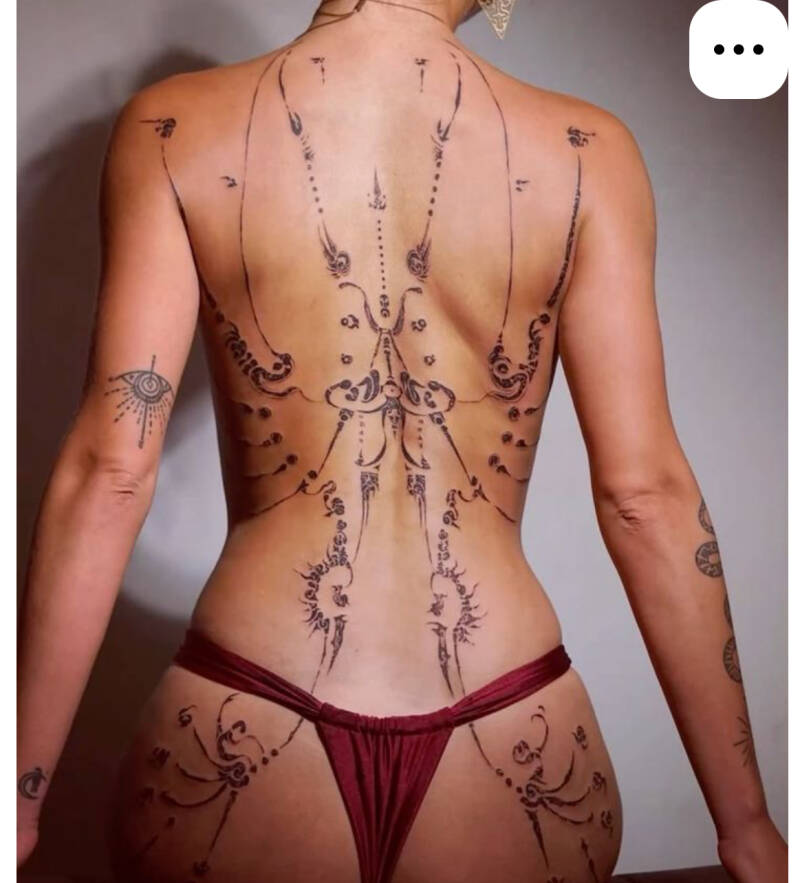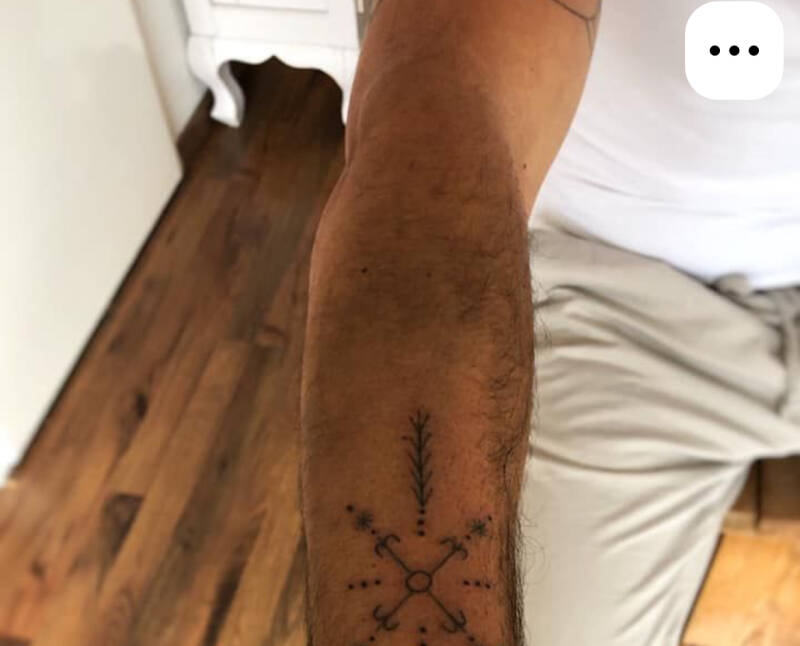Traditionele tattoo van Tjijani Reinders, de parang en salawaku;de bijl en het schild