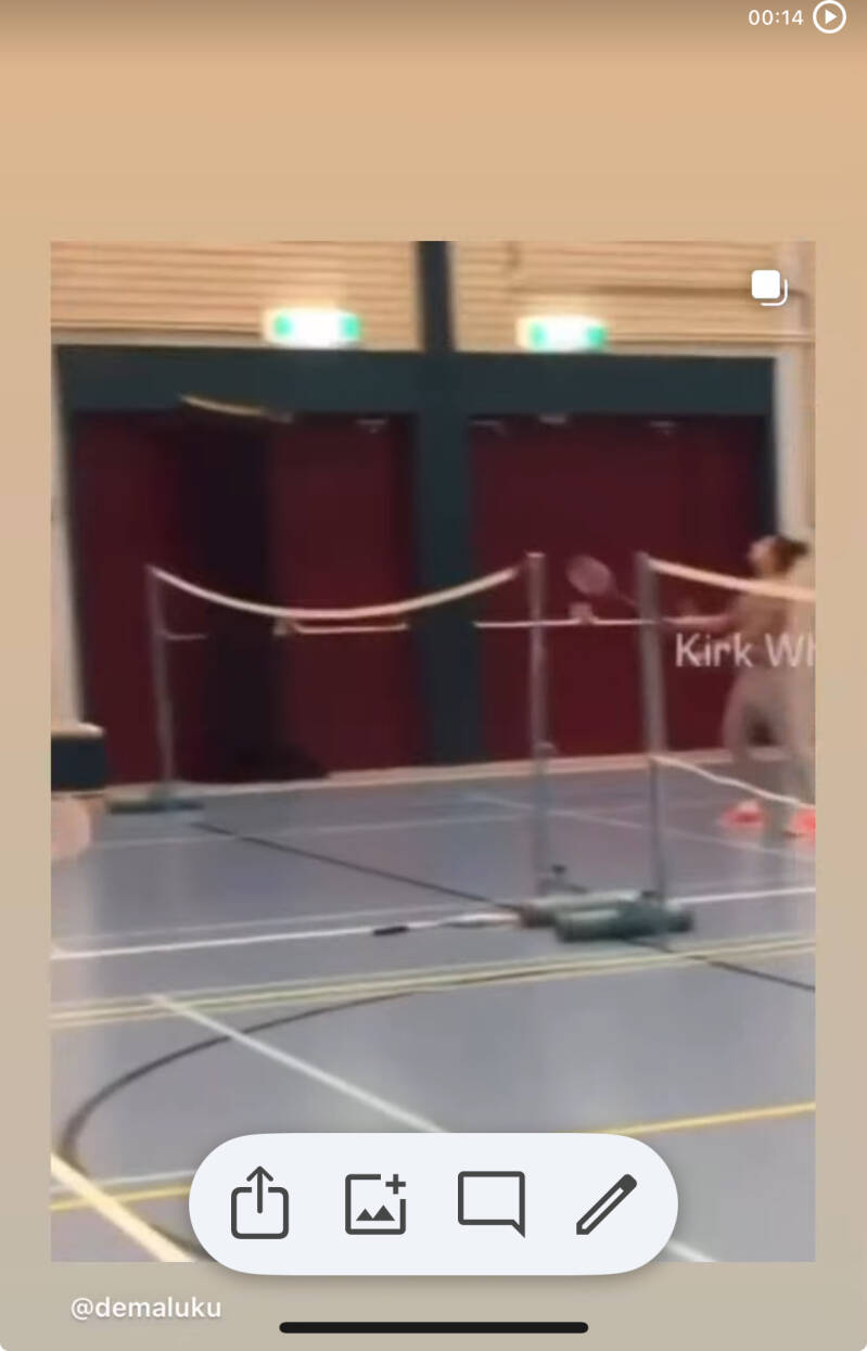 Badminton les-kingscourtwaarbij ik zelf moest meedoen bijj gebrek aan één leerling. Mijn tegenstander speelde bij de bekendebadmintonvereniging van Zijderveld in Amstelveen,waar mijn bestie Monique Schuchart jarenlang gespeeld heeft en van wie k het spel ook geleerd heb.