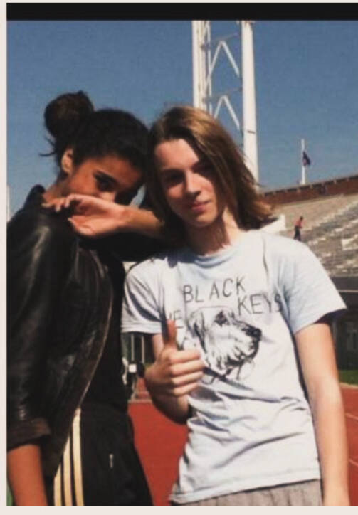 Oud leerling en topmodel Imaan Hammam met Abel Warmerdam tijdens het jaarlijkse atletiektoernooi van het vmboMediacollegellege Amsterdam in het Olympischstadion Amsterdam