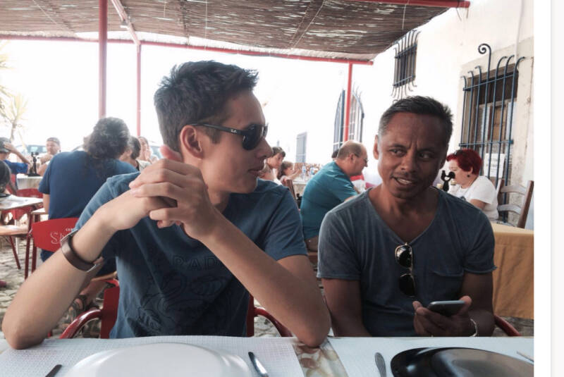 Rudjak eten bij mijn tante Joke bij Natsepabeach met op de voorgrond mijn neefje Mardo Maätita