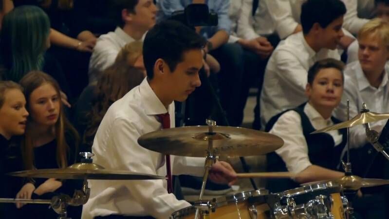 Finn speelt op drums tijdens de kooruitvoering van het Rudof SteinerCollege in de st Bavo kathedraal in Haarlem.